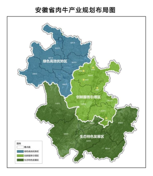 《規劃》立足安徽資源稟賦、環境承載能力、產業基礎和區位條件等因素,提出以良種繁育為引領,以標準化規模養殖為基礎,以產業融合為重點,以科技裝備為支撐,以種養循環為紐帶,以“雙招雙引”為抓手,著力擴規模、提質量、延鏈條、創品牌、增效益,培育千億級綠色食品肉牛產業,把安徽打造成中原高品質肉牛種源供應基地和長三角優質肉牛生產加工供應基地,為推動安徽農業強省、美好安徽建設貢獻力量。《規劃》運用畜禽糞污土地承載力測算方法和草畜平衡測算模型,科學開展資源環境承載能力分析,深入開展市場潛力及全國肉牛產業發展趨勢分析,多維度研究提出2023—2030年安徽肉牛產業發展目標。《規劃》堅持因地制宜、分類施策,統籌考慮區域功能與開發程度,將全省劃分為皖北、皖中、皖南三個肉牛產業優勢區,提出差異化發展策略,協調推進全省肉牛產業高質量發展。《規劃》共謀劃八大類23個重點項目,總投資419.05億元,并通過“自上而下”和“自下而上”相結合的方式,提出首批推進的項目清單,進一步提高了規劃的針對性和可操作性。