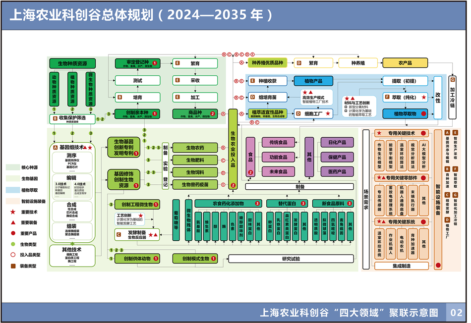 成果以“8個(gè)專題報(bào)告”為基礎(chǔ)凝練提出“總體規(guī)劃”。突出“創(chuàng)”“試”“制”三大功能,提出“立足大上海、服務(wù)長(zhǎng)三角、賦能全中國(guó),國(guó)內(nèi)領(lǐng)先、國(guó)際一流的健康農(nóng)業(yè)科產(chǎn)創(chuàng)新中心”總定位。應(yīng)用圖景分析方法和科產(chǎn)聚聯(lián)圖譜科學(xué)遴選細(xì)分賽道,提出打造四大領(lǐng)域科產(chǎn)集群、構(gòu)建三類(lèi)發(fā)展平臺(tái)、建設(shè)科創(chuàng)活力社區(qū)、加強(qiáng)人才集聚培育、推動(dòng)國(guó)際交流合作、深化國(guó)內(nèi)協(xié)同聯(lián)動(dòng)、加大品牌營(yíng)銷(xiāo)推廣、突出農(nóng)業(yè)示范應(yīng)用等主要任務(wù)。以“優(yōu)化利用本地存量、協(xié)同合作培育增量”為理念,提出1個(gè)農(nóng)業(yè)科創(chuàng)策源核、N個(gè)新質(zhì)產(chǎn)品制試區(qū)、X個(gè)科技農(nóng)業(yè)示范點(diǎn)的空間格局。以“借力”“合力”“魄力”為思路,從組織機(jī)制、科技支撐、要素保障、開(kāi)放合作四方面提出36類(lèi)保障建議。