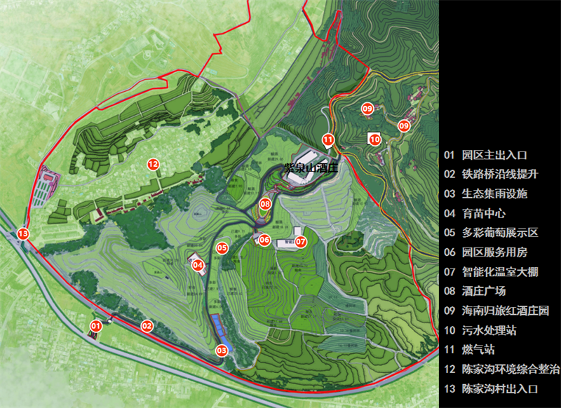 項(xiàng)目以“山水丹青地,萬畝釀瓊漿”為設(shè)計(jì)理念,以自然的山川田水與秦風(fēng)、商洛文化為依托,借葡萄景觀串聯(lián),集葡萄種植、釀造體驗(yàn)、文化感悟、休閑旅游、健康休閑于一體,展現(xiàn)獨(dú)特的地域文化與產(chǎn)業(yè)魅力,樹立景村融合發(fā)展典范。項(xiàng)目為建設(shè)集“農(nóng)業(yè)生產(chǎn)、科研創(chuàng)新、文創(chuàng)旅游”等功能于一體,以紅酒文化為核心的產(chǎn)業(yè)鏈延伸+農(nóng)業(yè)農(nóng)村功能拓展型產(chǎn)業(yè)融合示范園奠定良好開局,有利于打造中國本土葡萄酒產(chǎn)業(yè)現(xiàn)代化標(biāo)桿梯田式果園、景觀打卡地及農(nóng)文旅產(chǎn)業(yè)融合樣板。