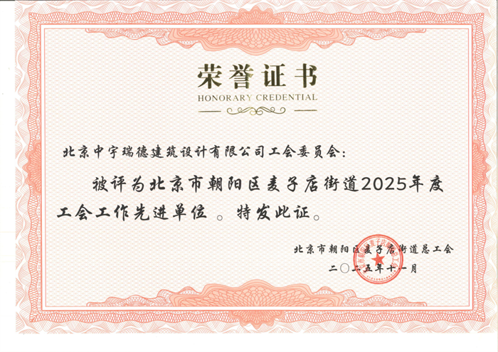 2025年,中宇瑞德建筑設計有限公司工會以“闖”的精神、“創”的勁頭、“干”的作風,在年末交出亮眼答卷12月17日,麥子店街道總工會召開了“2025年度工會工作表彰大會”,會上進行了年度總結并對麥子店轄區內先進基層工會進行表彰。本次評選是從麥子店街道總工會轄區內603家基層工會中選取56家先進單位。中宇瑞德公司工會委員會連續第四年獲“年度工會工作先進單位”稱號,這既是來自上級工會的認可,也是公司全體員工的收獲。