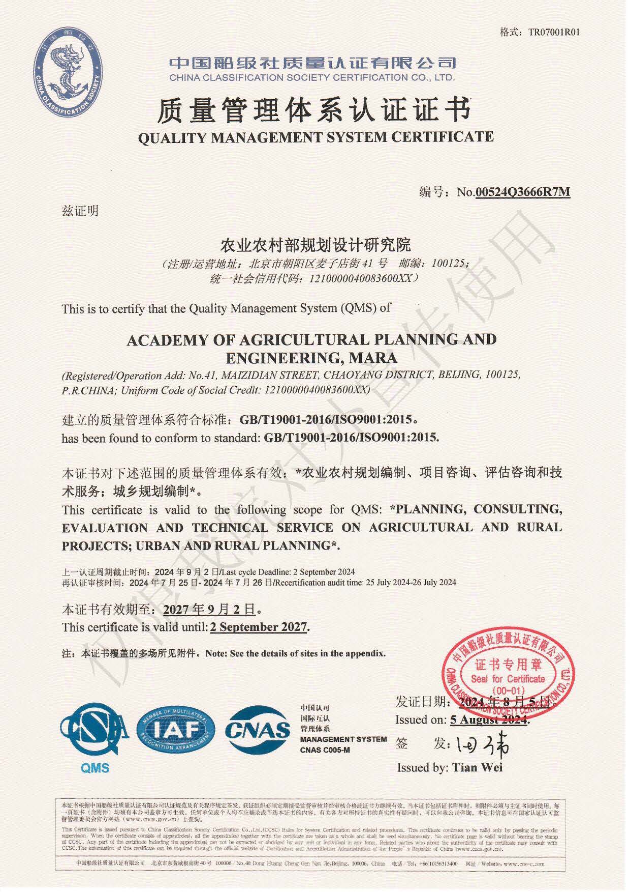 質量管理體系認證證書