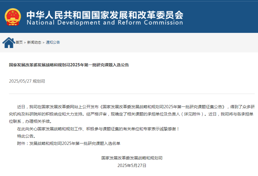 國家發(fā)展改革委發(fā)展戰(zhàn)略和規(guī)劃司是組織擬定并推動實施國家發(fā)展戰(zhàn)略和規(guī)劃的重要部門,其研究課題具有鮮明的政策導向性與重要的實踐價值。2025年面向社會公開征集的課題,涵蓋宏觀政策取向、經(jīng)濟發(fā)展目標、人工智能產(chǎn)業(yè)化、教育科技人才發(fā)展體制機制等內(nèi)容,前瞻性研究經(jīng)濟社會發(fā)展中的重大戰(zhàn)略問題,為國家制定“十五五”經(jīng)濟社會發(fā)展規(guī)劃提供參考依據(jù)。