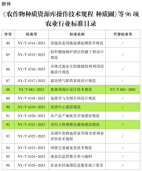近日,由我院設(shè)施農(nóng)業(yè)研究所主持編制的《多層立體規(guī)模化豬場(chǎng)建設(shè)規(guī)范》《洗消中心建設(shè)規(guī)范》、主持修訂的《畜禽場(chǎng)場(chǎng)區(qū)設(shè)計(jì)技術(shù)規(guī)范》等3項(xiàng)標(biāo)準(zhǔn)業(yè)經(jīng)專家審定通過,由農(nóng)業(yè)農(nóng)村部批準(zhǔn)發(fā)布為中華人民共和國農(nóng)業(yè)行業(yè)標(biāo)準(zhǔn),標(biāo)準(zhǔn)號(hào)分別為NY/T 4321-2023、NY/T 4319-2023、NY/T 682-2023(代替標(biāo)準(zhǔn)號(hào)NY/T 682-2003),自2023年6月1日起實(shí)施。