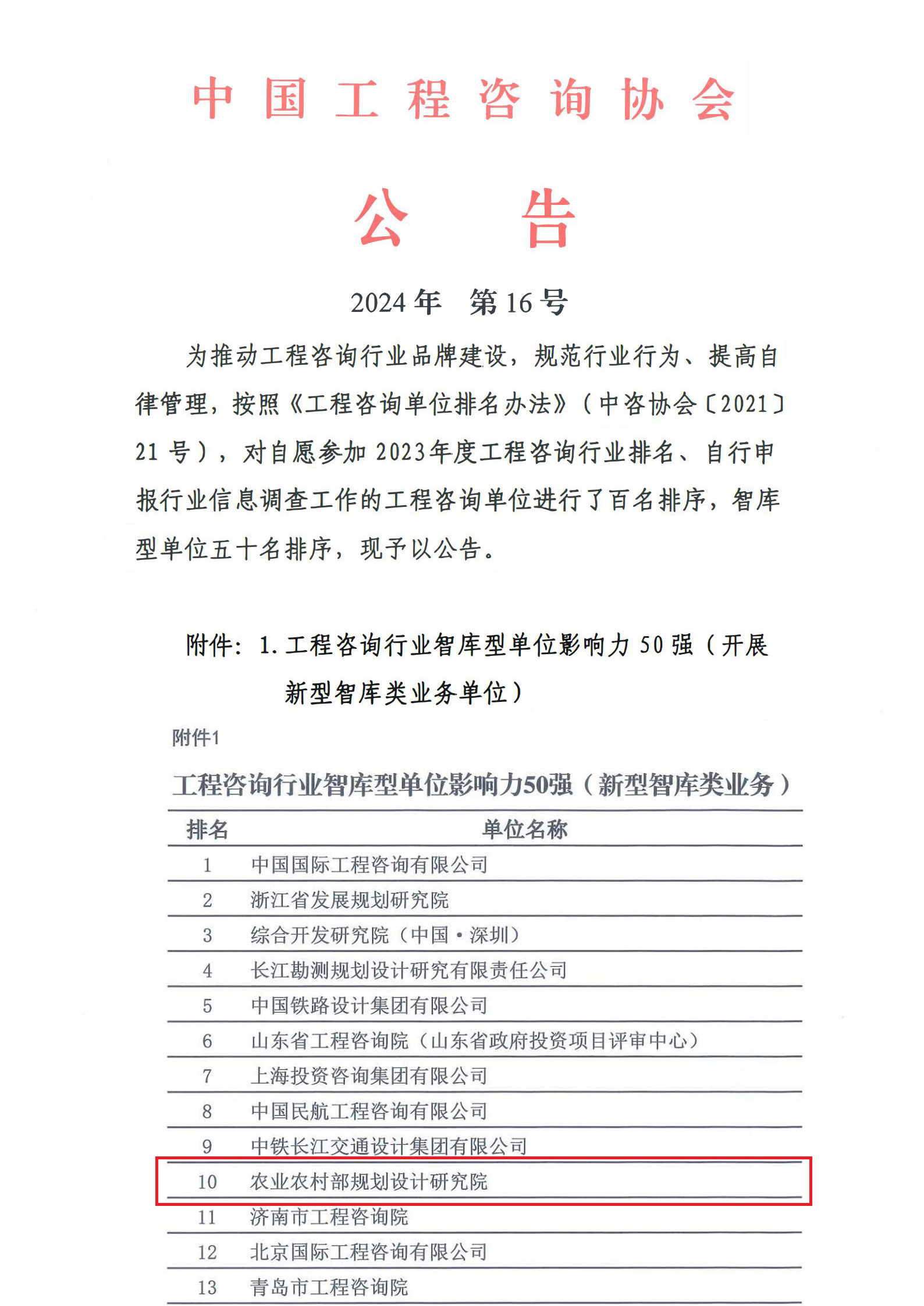 116日,中國工程咨詢協會發布公告,2023年度全國工程咨詢行業智庫型單位影響力50強公布,我院進入10,是農業、林業專業領域的唯一單位。至此,我院已連續三年入選全國工程咨詢行業新型智庫型單位影響力50強,彰顯了我院為各級政府部門推進鄉村全面振興、加快建設農業強國提供智力服務的能力和水平,進一步提升了我院在行業中的品牌影響力。