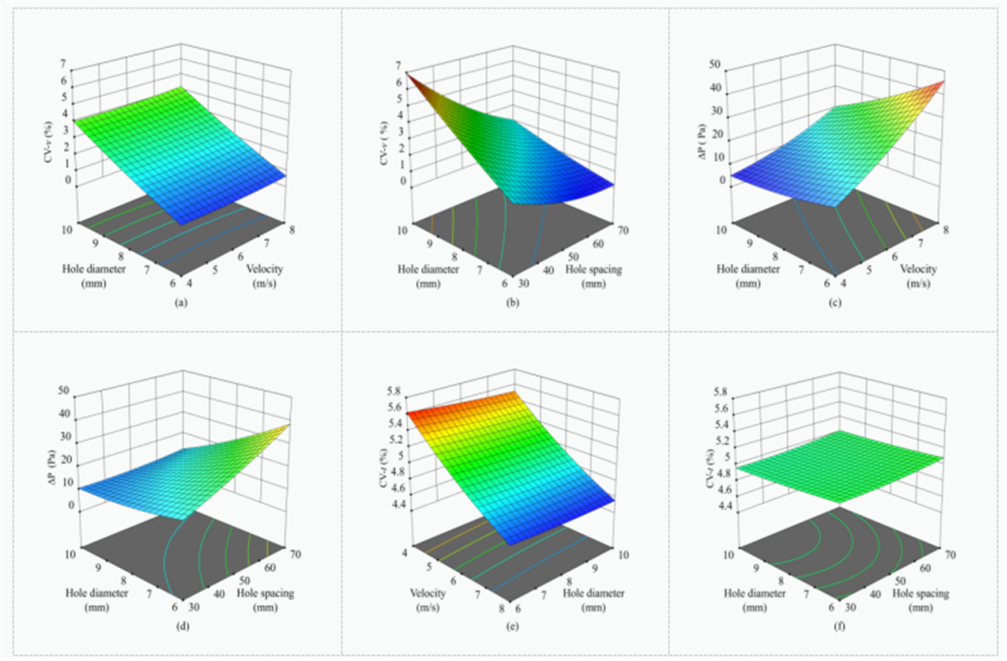 創(chuàng)新提出基于響應(yīng)面模型與多目標(biāo)優(yōu)化的穿孔風(fēng)管參數(shù)協(xié)同設(shè)計(jì)方法,揭示穿孔風(fēng)管結(jié)構(gòu)參數(shù)對(duì)氣流特性的影響機(jī)制,構(gòu)建了孔徑、孔間距、入口風(fēng)速與風(fēng)速均勻性、壓降及溫度均勻性的預(yù)測(cè)模型。結(jié)果表明大孔徑顯著改善風(fēng)速均勻性,而增大孔間距會(huì)降低均勻性;壓力損失呈相反趨勢(shì);溫度均勻性主要受入口風(fēng)速影響。敏感性分析揭示孔徑影響力最強(qiáng),其次為孔間距和風(fēng)速,且孔徑與間距交互效應(yīng)顯著。結(jié)合熵權(quán)TOPSISNSGA-II優(yōu)化,確定了“大孔徑,寬間距”最優(yōu)參數(shù)組合(孔徑9.0mm、間距65mm、風(fēng)速7.0m/s),該方案使風(fēng)速變異系數(shù)(CV-v)降低58.8%、溫度均勻性系數(shù)(CV-t)提升5.2%,壓力損失(?P)減少10.8%,能耗降低17.4%